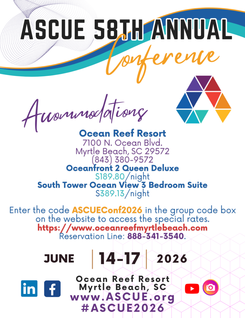 We will continue to monitor and update safety precautions for the ASCUE Conference regularly and follow guidelines in accordance with trusted national resources, state and local public health agencies, Ocean Creek Resort and Conference Center, and off-site event venues.